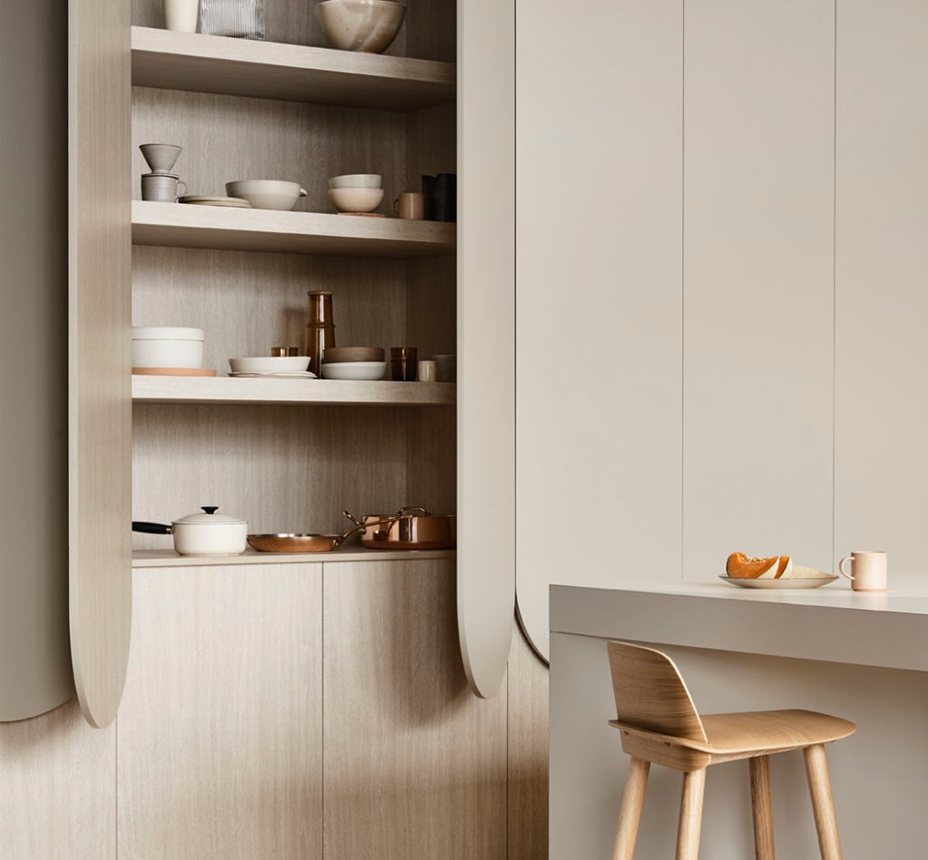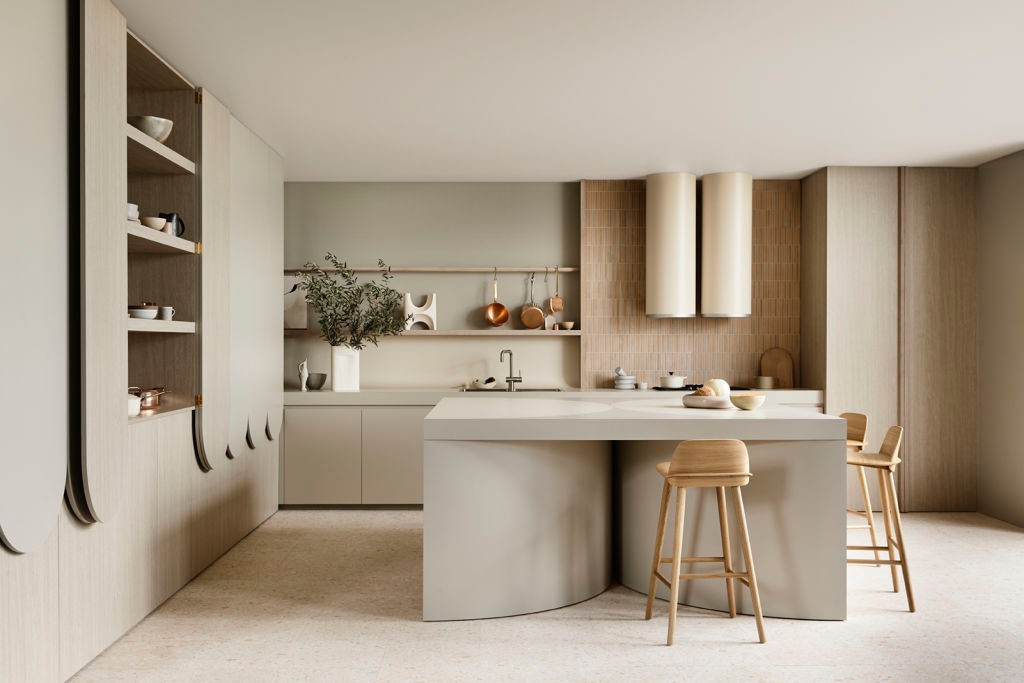 Using neutral decors from the Laminex Colour Collection, the kitchen embraces nature through sculptural curves, muted organic colours and soft woodgrains.